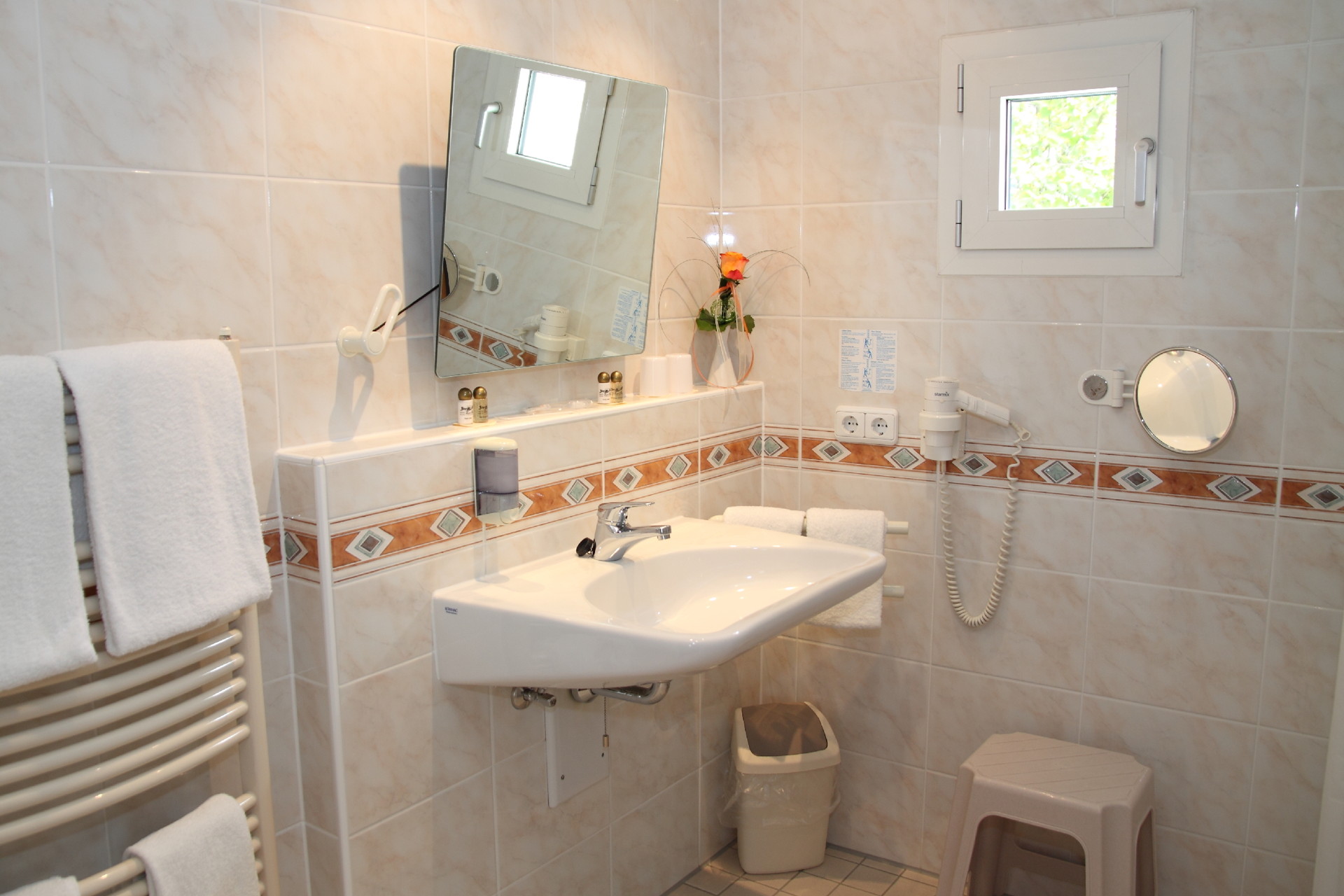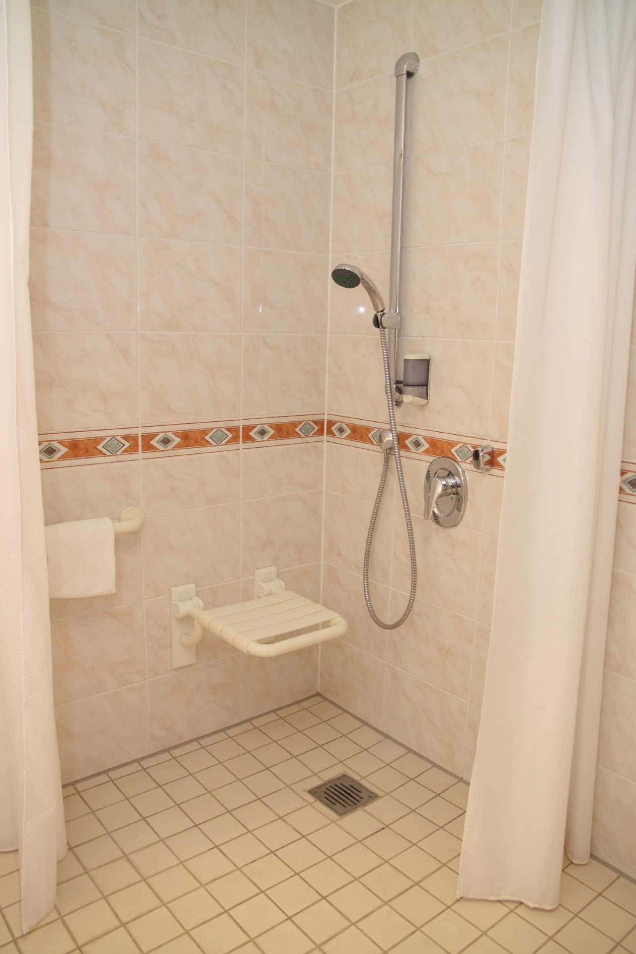 Our handicapped-accessible room is of high quality and decorated in a Mediterranean style and stepless accessible by elevator, as well as the sanitary area in the room. It is equipped with a sliding door, a swell-free shower with a folding seat and a toilet with holdings and offers as well as the generously designed rooms enough space for the mobility-free wheelchair users.